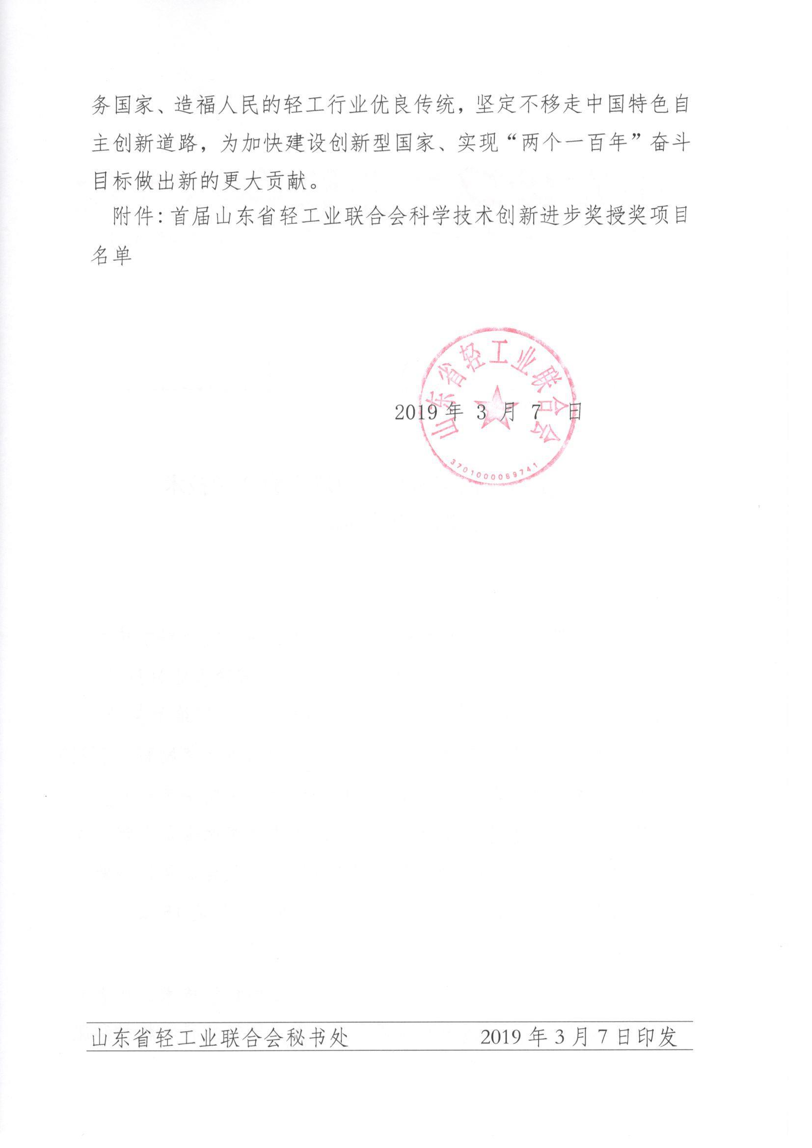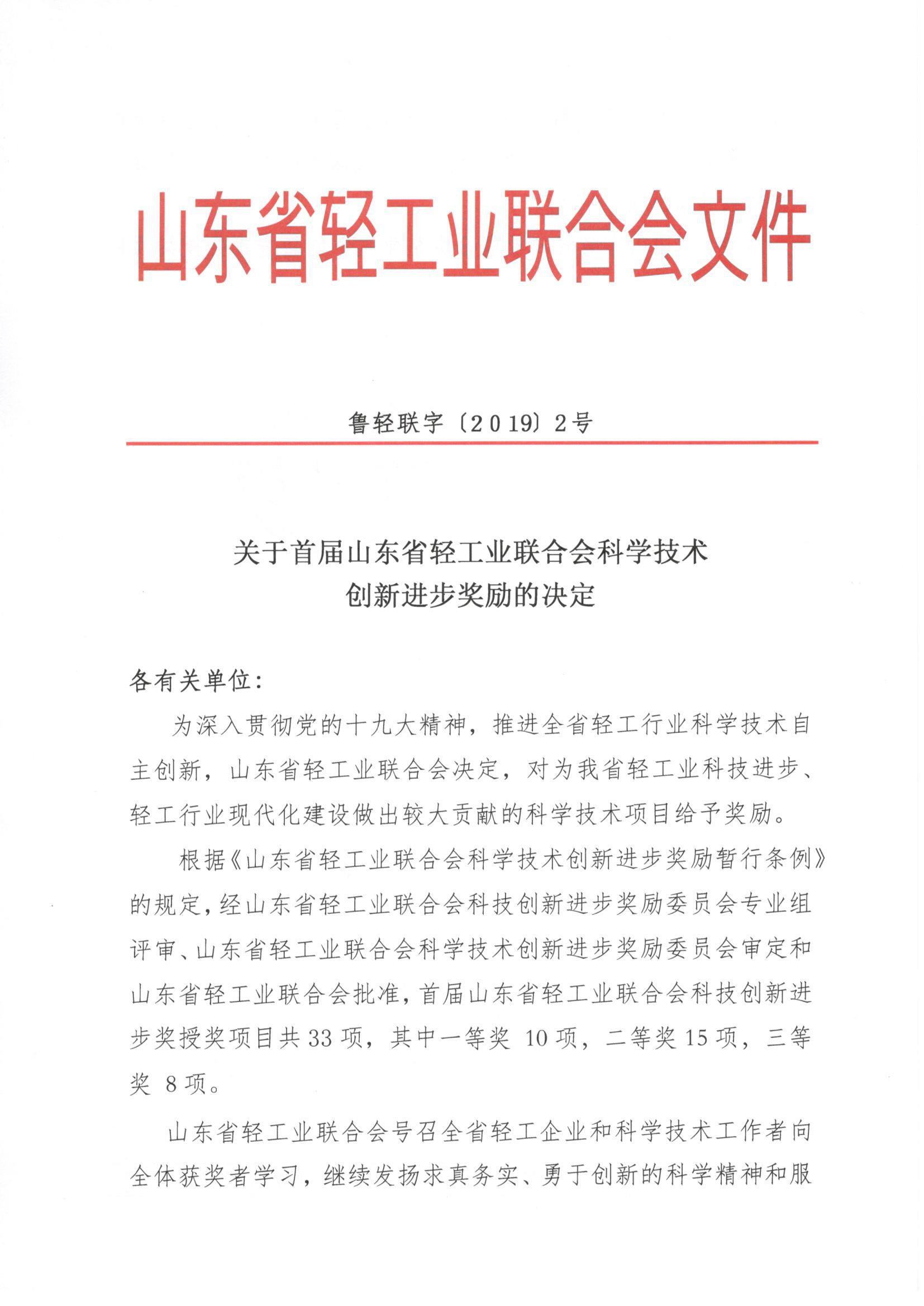 關于首屆山東省輕工業聯合會科學技術創新進步獎勵的決定