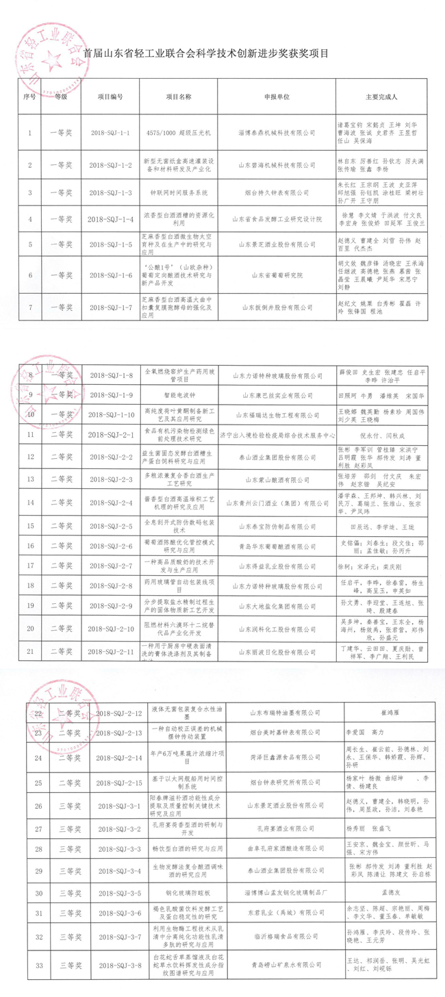 附件:首屆山東省輕工業聯合會科學技術創新進步獎授獎項目名單